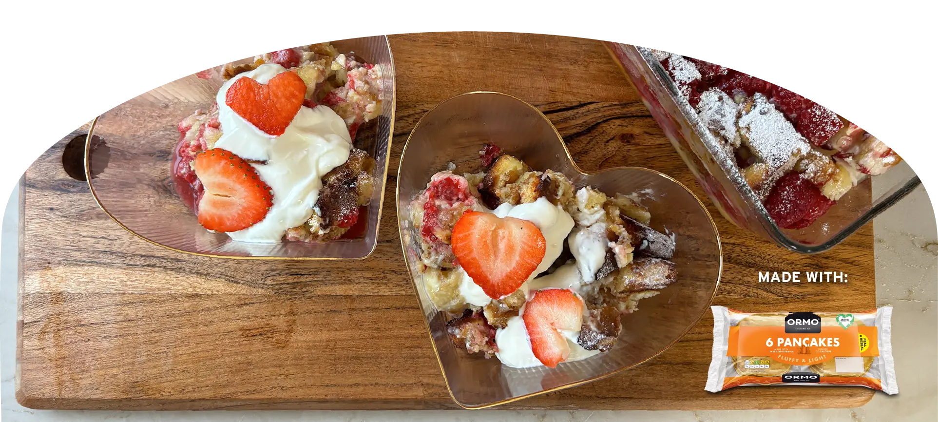 2. Layer the pancakes, raspberries, and white chocolate in a small ovenproof baking dish.